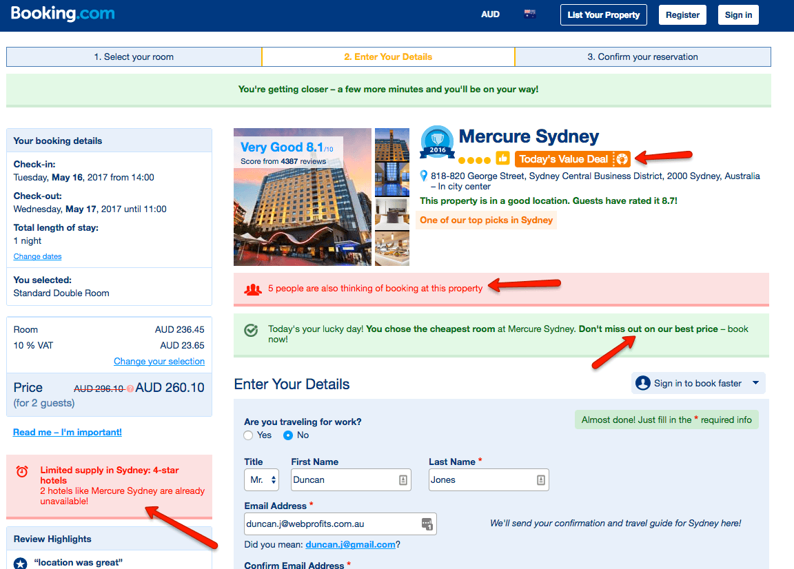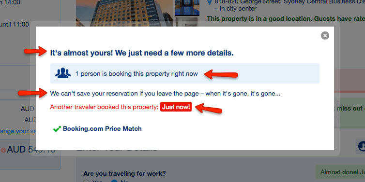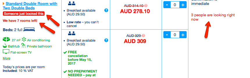 There is urgency throughout with “today”, “quick”, “X left”, “someone just booked” all screaming out to you to book now before you miss out on the room/best rate.