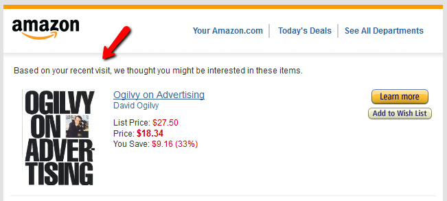 Amazon take their website personalisation to the next level, and also personalise the emails that are sent out and throughout the marketing that they do (for example in their dynamic remarketing) – this leads to not just a big increase in revenue but consumers valuing Amazon as the place to go to and see relevant products they are interested in.