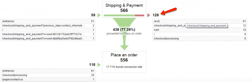If you’ve setup the funnel of your checkout process in Google Analytics properly, you’ll see a huge drop off in prospects exiting each step of the process:
