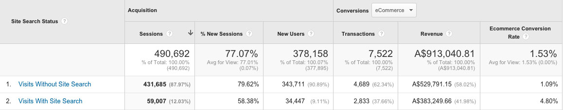 Its also worthwhile setting up Site Search in Google Analytics which will allow you to accurately drill down on what terms people are using (you’ll likely discover products you don’t currently stock but probably should!) and also to review the performance of each search result: