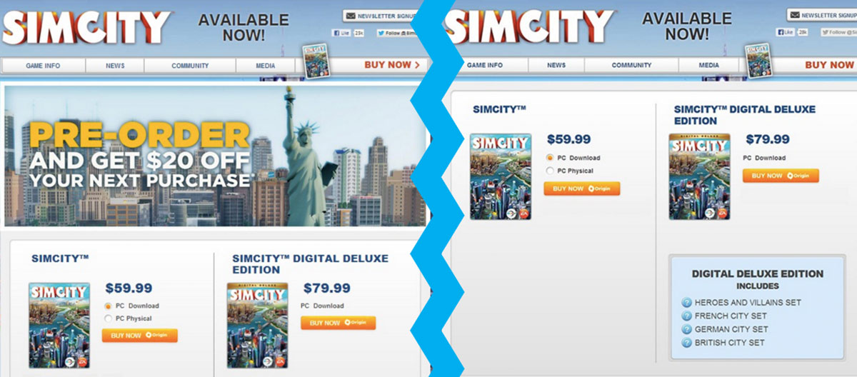 Electronic Arts assumed when they originally designed their SimCity product page that adding a promotion at the top would increase the number of sales they generated from traffic that landed on that page. But what they found (through testing) was that removing the promotion section actually increased conversions by 43.4%.