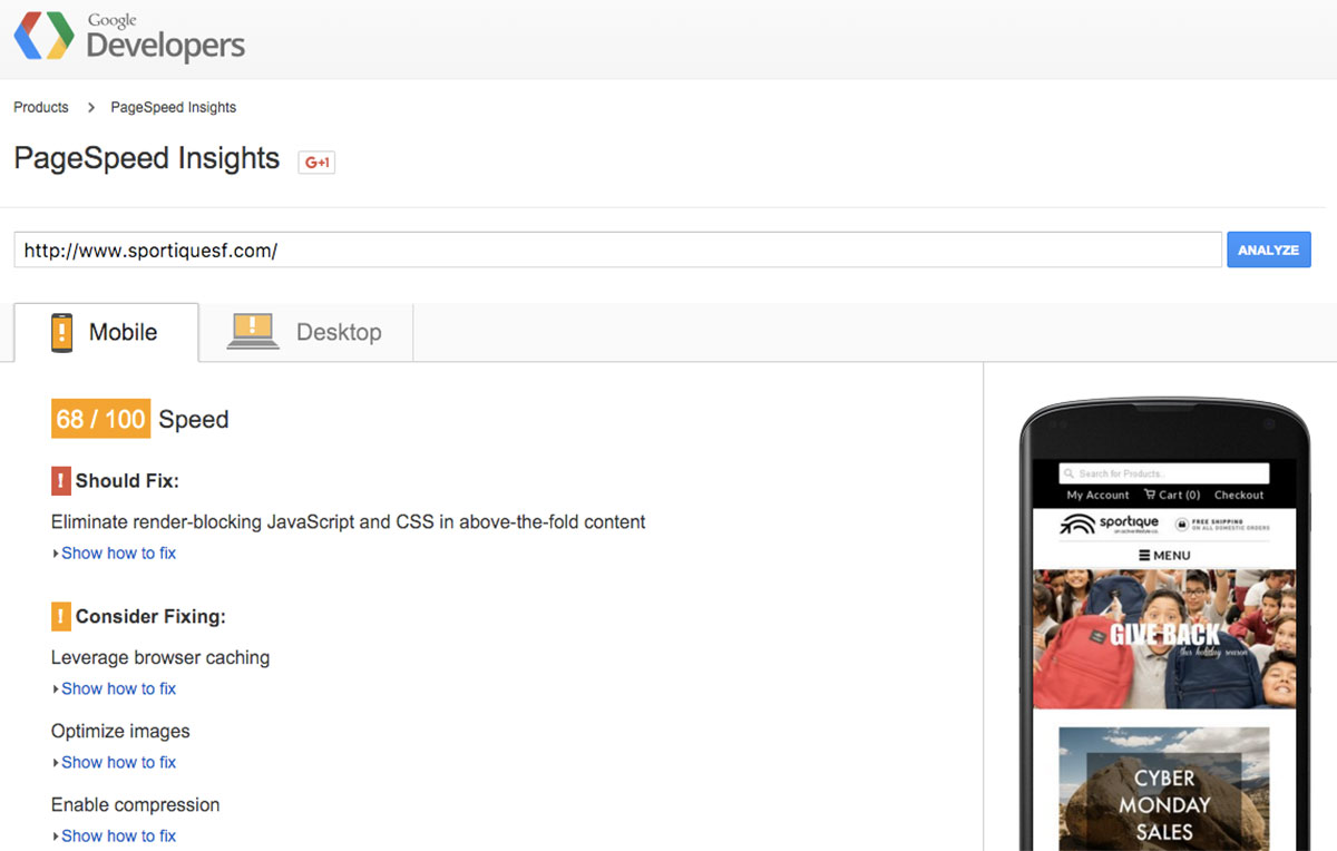 Next, head over to the Google PageSpeed Insights tool and type in your website. You’ll quickly have a list of things you can implement or fix that will speed up your site on both Desktop and Mobile devices.