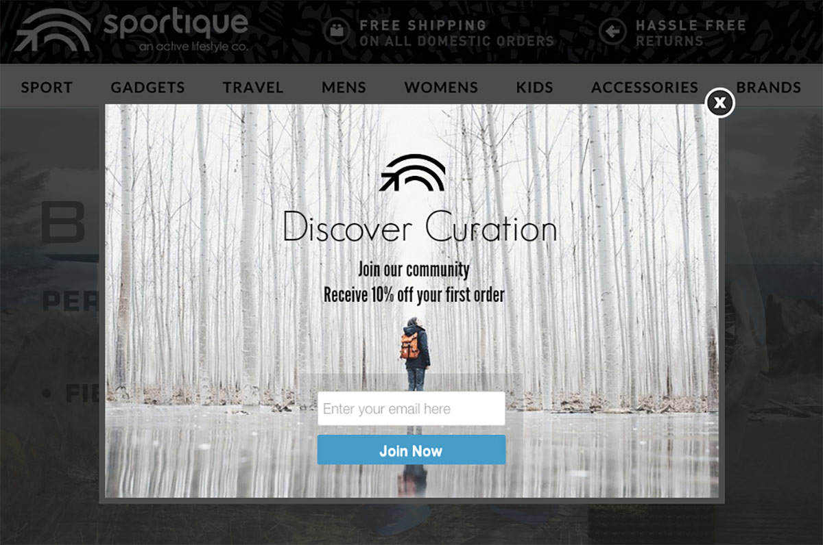 Sportique, a San Francisco based eCommerce company, uses a popup to get more people on their list and to increase sales. While your results may vary, they were able to boost their conversion rate by a whopping 50%. They didn’t report on their profit increase, but when giving discounts it’s important to ensure you measure profit (based on lifetime customer value) as well as on the overall sales increase. Sportique – as you can see below – made sure to limit the discount to the first order only: