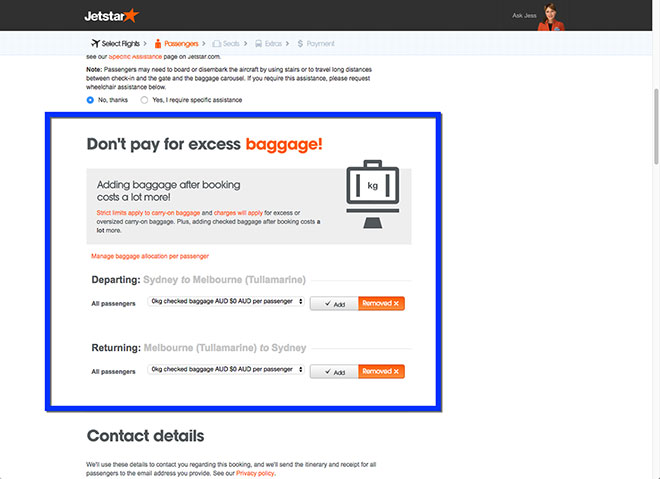 If someone has already added an item to their cart and started going through the checkout process, they are a ‘hot prospect’ and chances are they are going to purchase. Like the chocolate bars we’ve all been guilty of grabbing in a supermarket checkout, this is the perfect time to promote an offer thats too good to say no to. The key to this type of up-sell is ensuring (through testing) the offer is worth interrupting the user when checking out or you may lose the sale completely. Airlines such as Jetstar are very effective at this type of up-sell: