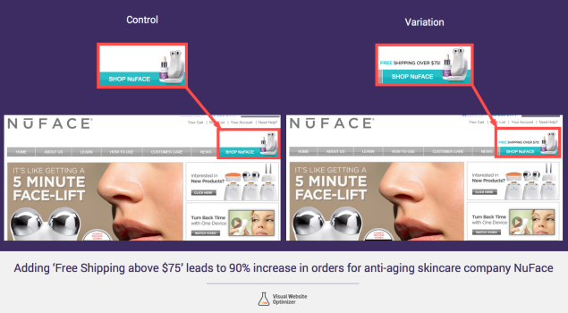 If you can offer free shipping with no conditions, implement it now and you should see instant results – especially when you add it into your marketing. If you can’t, there are still other options which may make more sense. For example, NuFace worked out that they could only offer the free shipping on orders over $75 and still be profitable. They tested adding this incentive to their site: