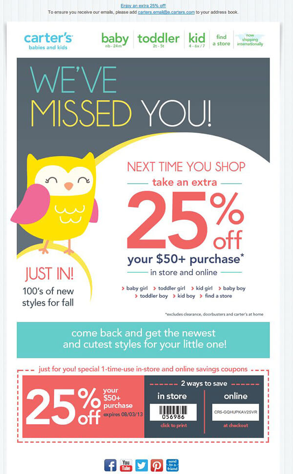 - Re-activation Campaigns – Triggered to people who have not purchased in some time with an incentive to come back and repurchase, i.e. we haven’t heard from you in a while, here’s 10% off to come back