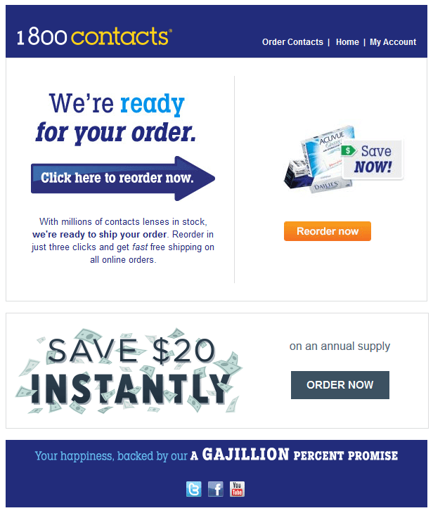 - Re-order Emails – Emails at set days since purchase pushing people to replenish consumable products they have purchased, i.e. buy more disposable shavers