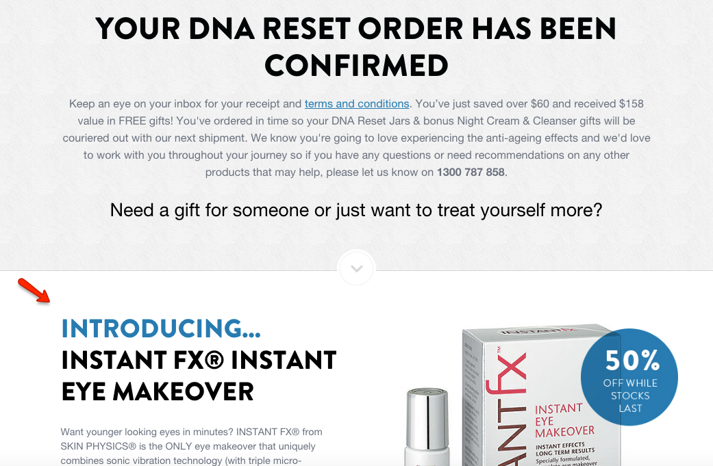 You’ve got the sale now and they’ve bought a few up-sells – its pretty much time to celebrate, right? Not quite … there’s still one place you can try and up-sell the order – the often neglected thanks or success page. Once you’ve gotten all their details, including payment method, with a bit of development work you can up-sell someone just by getting them to click a button to add an extra item, upgrade, or any other offer you have. An example of this is on a checkout process we built for Skin Physics which up-sold their DNA Reset product and pushed an extra offer on the thanks page: